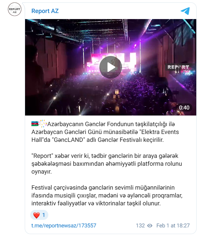 Azərbaycanın Gənclər Fondunun təşkilatçılığı ilə Azərbaycan Gəncləri Günü münasibətilə "Elektra Events Hall"da "GəncLAND" adlı Gənclər Festivalı keçirilir.