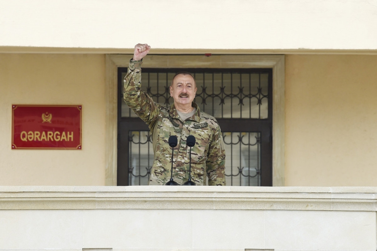“Nə, hansı amillər bu Qələbəni şərtləndirdi? Onların arasında birinci Vətən sevgisidir. Yəni, sizi ölümə aparan, “öldü var, döndü yoxdur” deməyə vadar edən Vətən sevgisi idi və biz bunu nümayiş etdirdik. Bütün dünyaya nümayiş etdirdik ki, biz böyük xalqıq və müharibəni biz ləyaqətlə aparmışıq. Mənfur düşmən döyüş meydanında məğlubiyyətə uğrayarkən bizim şəhər və kəndlərimizi namərd atəşə tutmuşdur. Yüzdən çox dinc insan, onların arasında uşaqlar, qadınlar bu namərd atəş altında öz həyatlarını itirdilər. Biz isə ləyaqətlə müharibəni apardıq və müharibə zamanı mən deyirdim ki, biz qisasımızı döyüş meydanında alacağıq. Biz mülki vətəndaşlarla heç vaxt vuruşmamışıq və vuruşmayacağıq. Azərbaycan xalqının ülvi keyfiyyətləri bizə imkan verməz və belə də oldu. Bütün dünya bunu etiraf edir ki, azərbaycanlılar ləyaqətlə vuruşdular, kişi kimi vuruşdular, düşməni qovdular, diz çökdürdülər və öz sözlərinə əməl etdilər”.