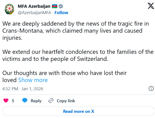 Azərbaycan Xarici İşlər Nazirliyi (XİN) İsveçrəyə Kran-Montanadakı faciəvi yanğınla bağlı başsağlığı verib.