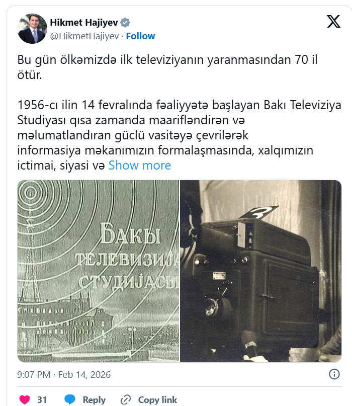 Aznews.az xəbər verir ki, bunu Azərbaycan Respublikası Prezidentinin köməkçisi - Prezident Administrasiyasının Xarici siyasət məsələləri şöbəsinin müdiri Hikmət Hacıyev "X"dəki hesabında yazıb.