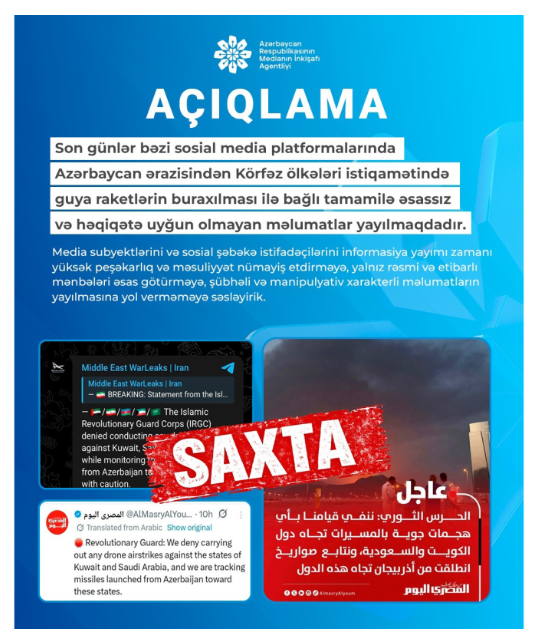"Son günlər bəzi sosial media platformalarında Azərbaycan ərazisindən Körfəz ölkələri istiqamətində guya raketlərin buraxılması ilə bağlı tamamilə əsassız və həqiqətə uyğun olmayan məlumatlar yayılmaqdadır".