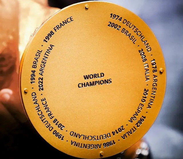 “İndiyədək 22 dünya çempionatı baş tutub, lakin Dünya Kubokunun altında 13 çempion ölkənin adı yazılıb. Çünki bu kubok ilk dəfə DÇ-1974-də təqdim edilib. Dünya Kubokunun altında qalib komandaların adları öz dilində yazılıb: 1974 - Deutschland (Almaniya - red.), 1978 - Argentina, 1982 - Italia, 1986 - Argentina, 1990 - Deutschland, 1994 - Brasil, 1998 - France, 2002 - Brasil, 2006 - Italia, 2010 - España (İspaniya - red.), 2014 - Deutschland, 2018 - France, 2022 - Argentina.