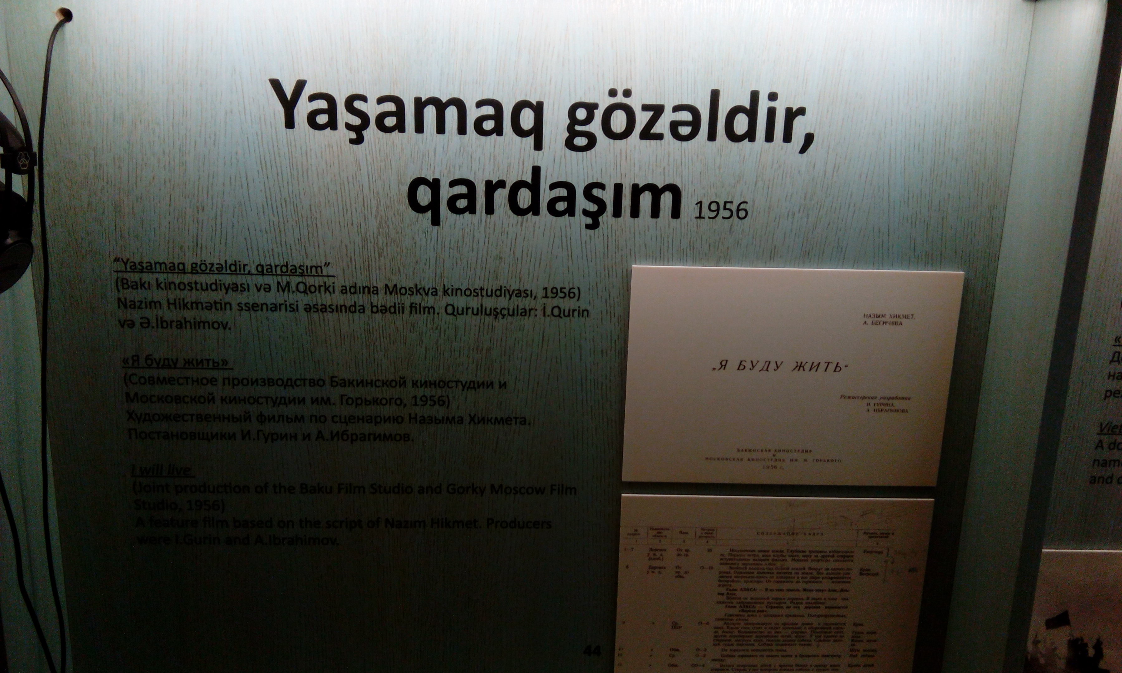 Üçüncüsü, burada “Yaşamaq gözəldir, qardaşım” filmi ilə bağlı məsələyə xüsusi toxunmaq lazımdır. Qeyd etmək istəyirəm ki, Azərbaycan kinosu tarixində bu adda yalnız bir tammetrajlı bədii film çəkilib. Həmin film muzeyin məlumat lövhəsində göstərildiyi kimi 1956-cı ildə deyil, əslində 1966-cı ildə istehsal olunub. Filmin quruluşçu rejissorları debütantlar Ramiz Əsgərov və Antonis Voyazosdur. Və ən əsası – həmin filmin musiqisinin müəllifi Qara Qarayev yox, Azərbaycanın digər görkəmli bəstəkarı Fikrət Əmirovdur. Göründüyü kimi, “Yaşamaq gözəldir, qardaşım” (1966) filminin Q. Qarayevin yaradıcılığı ilə birbaşa və ya dolayı yolla heç bir bağlılığı yoxdur.