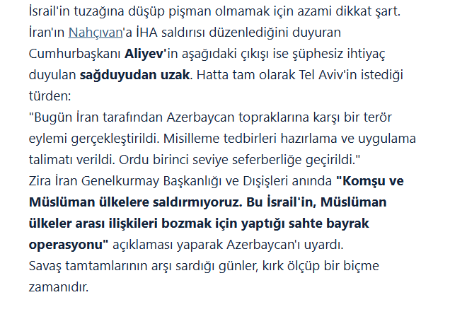 İran'ın Nahçıvan'a İHA saldırısı düzenlediğini duyuran Cumhurbaşkanı Aliyev'in aşağıdaki çıkışı ise şüphesiz ihtiyaç duyulan sağduyudan uzak. Hatta tam olarak Tel Aviv'in istediği türden”