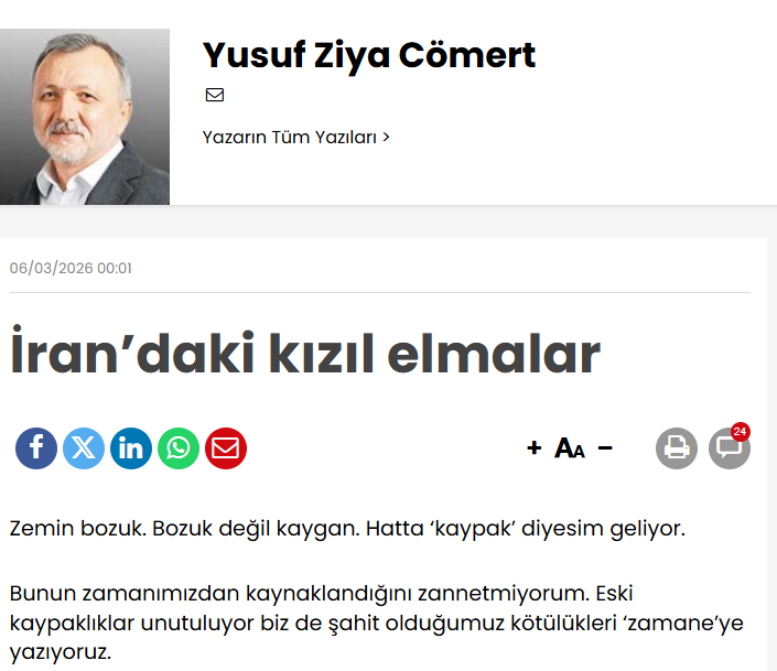 “Karar” qəzetinin internet versiyasında Yusif Ziya Comərd adlı müəllif İrandakı qızıl almaları saymağa başlayıb. “Qızıl alma” kəliməsi sizi çaşdırmasın. Yusif Ziya, əvvəla, bu kəliməni “mükafat” mənasında işlədir. Əlavətən, Google-də həmin müəllifin adını axtaranda, ismi Fətullah Gülənin saytından çıxır. Meyiti ortada qaldığından hələ Fətullah Gülənin yanına gedib çıxmamış Xəmneyinin qurduğu istibdad rejiminin çökməsi nədənsə keçmiş “Zaman” yazarının da sinirlərinə toxunub.