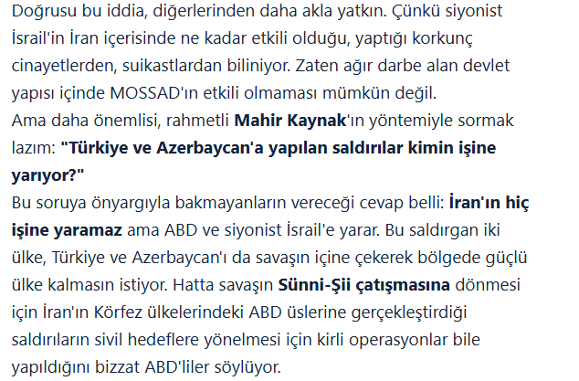 Üyütmək demişkən, İran və Rusiya propaqandası “ABŞ və İsrailin İrandan sonrakı hədəfi Türkiyədir” deyə məqsədli şəkildə bir tezis ortaya atıb və Yılmaz Özdilin təbirincə desək, sayın Türkiyə mediası da bu tələyə düşüb. Bir NATO üzvü olan Türkiyə ilə münaqişəyə girmək Bəşər Əsədin və ya regiondakı ərəb krallarının ağlına gələ bilər, amma nə ABŞ-ın öz əsas müttəfiqini xərcləmək kimi bir plan cızar, nə də İsrail sekulyar bir dövlətlə döyüş meydanında üz-üzə gəlməyi arzulayar.