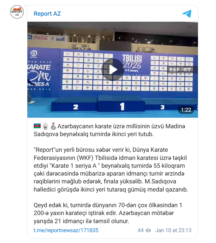 Azərbaycanın karate üzrə millisinin üzvü Mədinə Sadıqova beynəlxalq turnirdə ikinci yeri tutub.