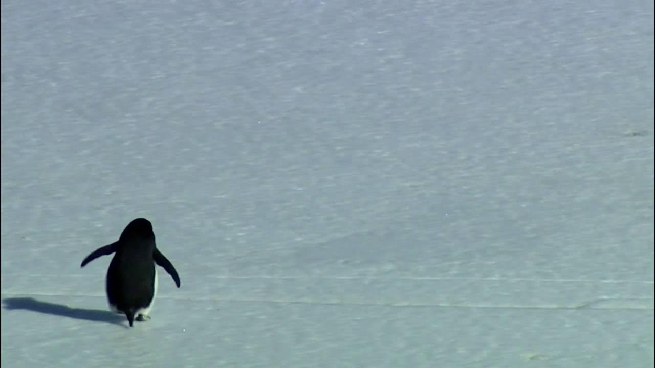 Filmdə də bu səhnə əvvəlcə tam sıradan çıxmış və yanlış istiqamət götürmüş bir fərdi davranış kimi təqdim olunur; Herzog buna bəzən “ölüm yürüşü” ifadəsini işlədir, çünki bu səfər pinqvin üçün çox güman ki, sağ qalmaqla nəticələnmir.