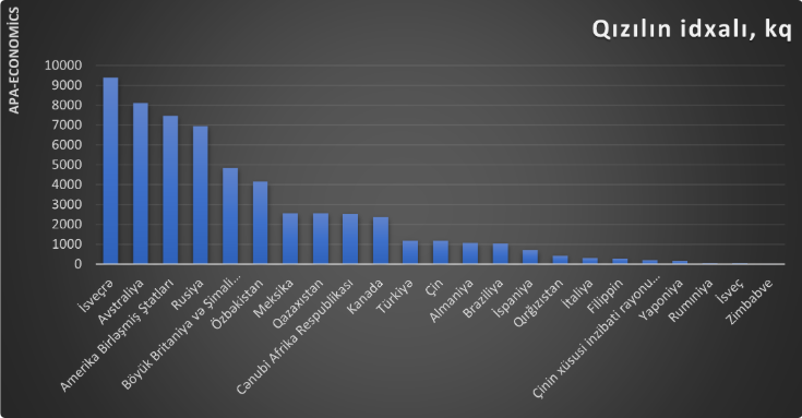 Qeyd edək ki, ötən il Azərbaycanda 2965.1 kq qızıl istahsal edilib. Bu dövrdə Azərbaycandan İsveçrəyə 326.2 milyon ABŞ dolları dəyərində 4522.4 kq emal olunmamış qızıl ixrac edilib.