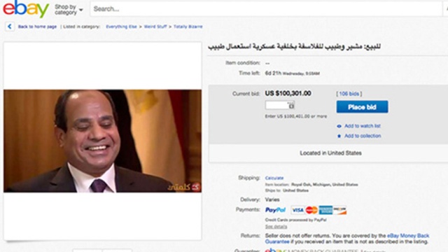 AzNews.az xəbər verir ki, insanlar Misir prezidenti Əbdül Fəttah əs-Sisini satmaq qərarına gəliblər. Cəmi bir neçə saat ərzində Misir liderinin dəyəri 100 min dolları ötüb. "Məhsul"un təsvirində qeyd olunub ki, əs-Sisi feldmarşal, hərbçi keçmişi olan fəlsəfə doktorudur. Bununla yanaşı Misir prezidenti "əvvəlki sahibləri tərəfindən istifadə olunmuş" kimi xarakterizə olunub. Lakin "yaxşı vəziyyətdə" olduğu da vurğulanıb.