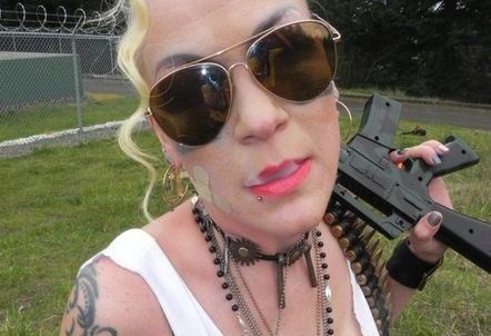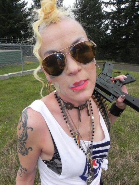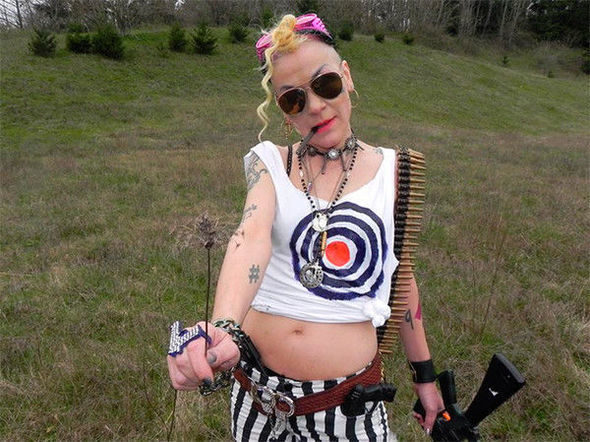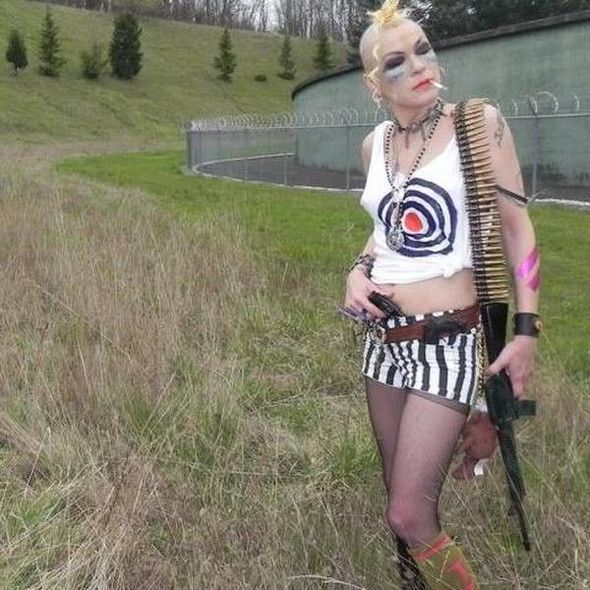 Şəkillərdə Evans oyuncaq avtomatla, iki tapança ilədir. Əynində cırılmış corabların üstündən geyilən şort, çiynində isə pulemyot darağı lenti asılıb. Kəmərində plastik qandallar və eynək, eləcə də kiçik məxmər ayıcıq var.