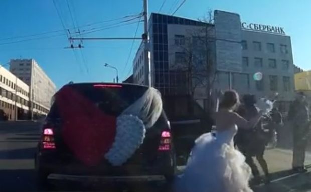 Avtomobildən çıxan gəlin gül buketi ilə bəyi döyməyə başlayıb. Sonradan cütlüyə yaşlı qadın yaxınlaşaraq - onun gəlinin anası olması təxmin edilir - əlindəki sumka ilə bəyi döyməyə qoşulub.