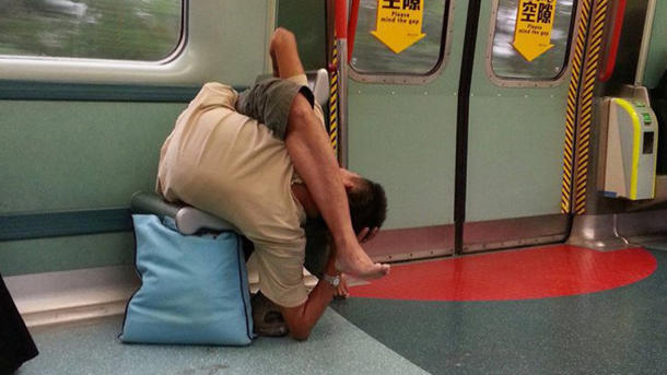 Honkonqda metroda, vaqonların birində ayağını boynuna keçirərək qəribə pozada oturan şəxs görənləri təəccübləndirib.