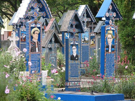 Rumıniyanın Sapıntsa şəhərində "Şən qəbiristanlıq" vardır. Qəbiristanlığın "Şən qəbiristanlıq" adını daşımasına səbəb burada olan qəbirlərin xaçlarının üzərində ölən adamların məşğuliyyəti və həyatından olan səhnələrin rəngli rəsmlərlə çəkilməsi, adamların şəxsiyyəti barədə yumorla şerlər yazılmasıdır. 1935-ci ildə yunan-katolik keşişinin, eyni zamanda, rumın dili və latın dili müəllimi olan Qrigore Ritiunun təşəbbüsü ilə xaçların enini bir az böyütmüş kitabə üçün yer qoymuşdur. 1960-ci ildən bəri qəbiristanlıqda 800-ə yaxın belə xaç vardır. İndiki qəbiristanlıq açıq havada muzeydir. Bəzi xaçların hər iki tərəfində rəsmlər görmək olar. Bir tərəfdə ölən adamın həyatı, arxasında isə ölümün səbəbi göstərilmişdir.(Azər Tac)