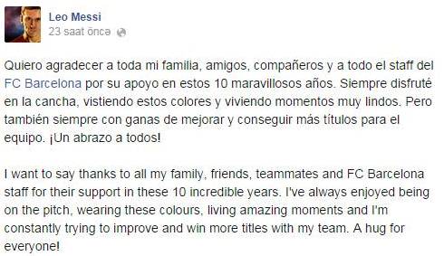 AzNews.az xəbər verir ki, Lionel Messinin "Barselona"da keçirdiyi 10 illiyi ilə bağlı yazdığı statusu 700 minə yaxın insan bəyənib, 37 min insan isə bu haqda şərh yazıb.