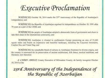 Azərbaycan Respublikasının müstəqilliyinin 23-cü ildönümü münasibətilə ABŞ-ın Vinkonsin ştatının Miluoki Dairəsinin (Milwaukee County) rəhbəri Kris Abele 2014-cü il 18 oktyabr tarixinin bu dairədə Azərbaycan müstəqilliyi günü kimi tanınması barədə bəyanat qəbul edib.