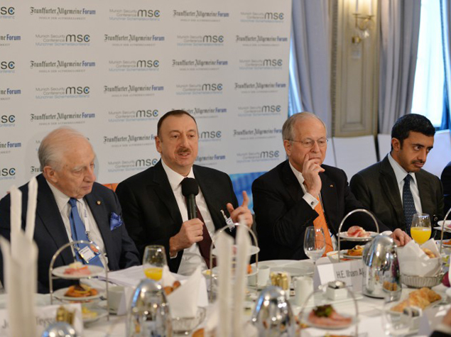 Azərbaycan prezidenti İlham Əliyev "dəyirmi masa"da iştirak edib.Əvvəl Münxen Təhlükəsizlik Konfransının sədri Volfqanq Fredrik İşinger tədbir iştirakçılarını və Azərbaycan Prezidenti İlham Əliyevi salamlayıb. Artıq Münxen Təhlükəsizlik Konfransı çərçivəsində müzakirə olunan məsələlərin əhatə dairəsinin genişləndiyini, 2013-cü ildən bu siyahıya enerji təhlükəsizliyinin də daxil olduğunu deyən Volfqanq Fredrik İşinger prezident İlham Əliyevə bu müzakirələrdə iştirakına görə təşəkkür edib və "dəyirmi masa"nın işinə uğurlar arzulayıb. Sonra tədbirin aparıcısı sözü Azərbaycan prezidentinə verib.