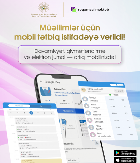 “Rəqəmsal məktəb” layihəsi çərçivəsində hazırlanan “Müəllim” tətbiqi mövcud elektron jurnalın funksional imkanlarını genişləndirir və istifadəçilərə sistemə mobil telefon vasitəsilə daha rahat və operativ çıxış imkanı yaradır.