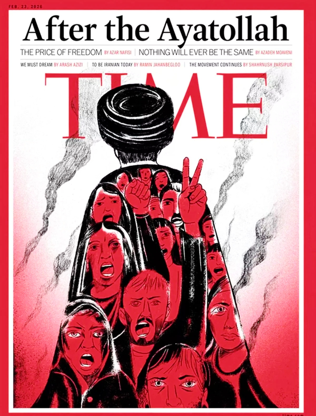 Rəssam Edel Rodrigezin müəllifi olduğu illüstrasiyada İranın ali dini lideri Ayətullah Əli Xamenei üzü görünməyəcək şəkildə, arxası tamaşaçıya dönük formada təsvir olunub. Qırmızı tonların üstünlük təşkil etdiyi təsvir ölkədə artan etirazları və yüksələn ictimai gərginliyi simvolizə edir.