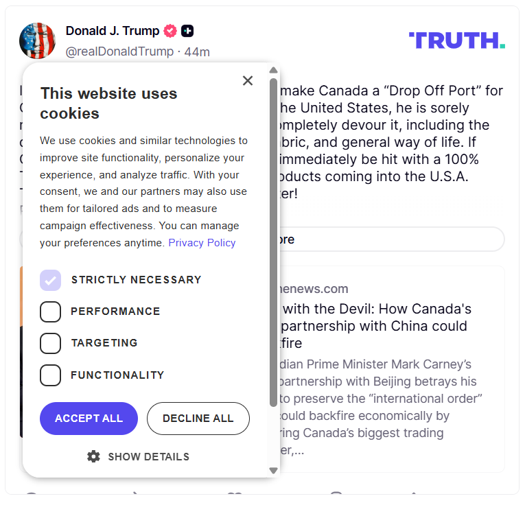 "Əgər qubernator Karni (Kanadanın Baş naziri Mark Karni - red.) düşünürsə ki, o, Kanadanı Çinin mal və məhsullarını Birləşmiş Ştatlara göndərmək üçün "transfer limanı"na çevirəcək, o, dərindən yanılır. Çin Kanadanı "diri-diri yeyəcək", biznesləri, sosial strukturu və ümumi həyat tərzinin dağılması da daxil olmaqla, onları tam "udacaq". Əgər Kanada Çinlə sövdələşmə bağlasa, Kanadanın ABŞ-yə daxil olan bütün mal və məhsullarına dərhal 100 % rüsum tətbiq ediləcək", - yazıda qeyd olunub.